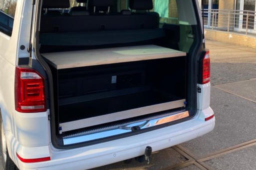 Michaels Heckauszug ist fertig!Der Auszug ist komplett aus Aluminium gefertigt und mit einem rutschhemmenden Lack beschichtet.Als Abschluss dient eine geschliffene Edelstahlblende. Belastbar ist der Auszug mit bis zu 240 Kg.Das Heckboard aus Multiplexholz ist lediglich geschliffen. Befestigt ist der Auszug an den original Multivan Schienen. Die Schublade ist in ein- und ausgefahren arretierbar.